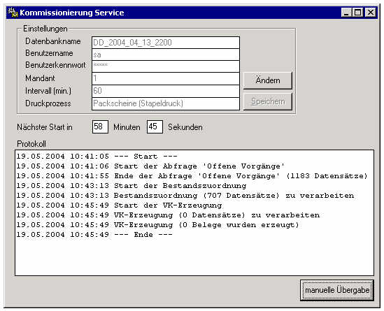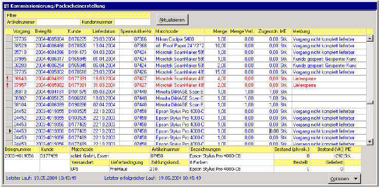 Dies ist die Anzeige des vollautomatischen Kommissionier-Dienstes welcher in regelmässigem Intervall vollautomatisch die Bestände zu offenen Aufträgen zuordet und im Lager automatisch die Packscheine ausdruckt.