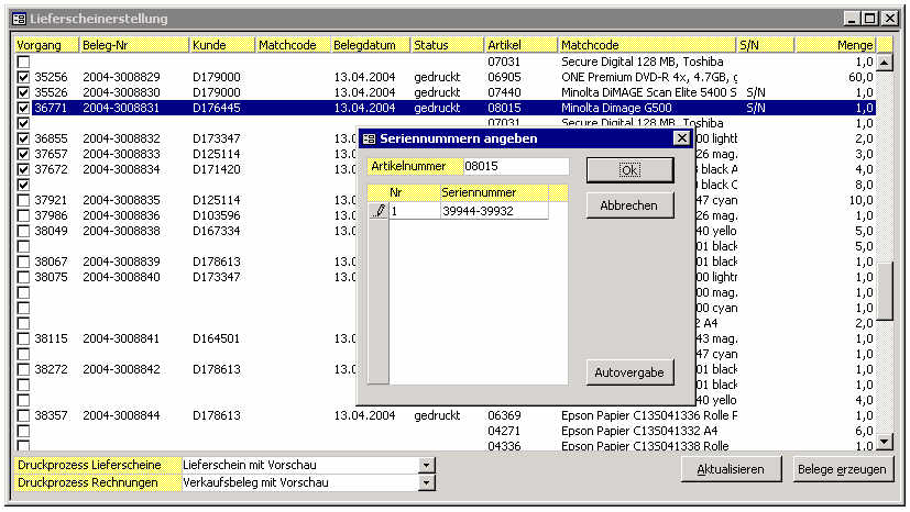 Dies ist die Anzeige der bereits im Lager ausgedruckten Packscheine, für welche ein Lieferschein/eine Rechung erstellt werden kann. Bei seriennummernpflichtigen/chargenpflichtigen Artikeln werden die Seriennummern/Chargen automatisch abgefragt